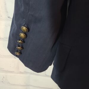 Ann Taylor Loft Military Style Cropped Blazer Jacket. Sz 12. 19" pit-to-pit. Hook & eye closures. Navy blue. Good condition. Smoke free home.