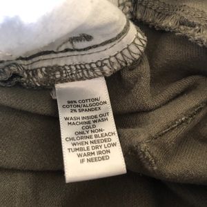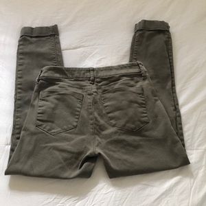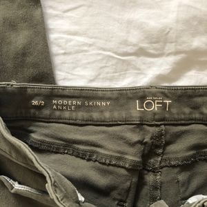 This is a pair of pre-owned women's Ann Taylor Loft Modern Skinny Ankle pants in a size 26 or size 2. Pants are an olive green color and have sewn cuffs at bottoms which hit at the ankle for a cropped fit. Great condition with no obvious signs of wear or flaws. Pants have stretch due to the spandex they have and are high quality.