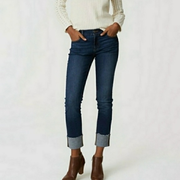Ann Taylor LOFT Modern Straight jeans with a cuffed raw edge hem. Cuff is NOT sown down and may be adjusted. Zip fly with button closure, 5 pocket styling, and whisker fading detail. 91% cotton, 7% polyester, 2% elastase. Excellent used condition, no signs of wear. Waist: 26 inches, rise: 8.5”, inseam: 30.5” cuffed or 33.5” uncuffed. 13.5” leg opening. Women's size 26