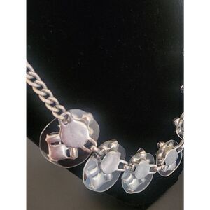 The necklace is an Ann Taylor Loft silver-tone bib style statement necklace. It features seven circular pendants, each adorned with green, light blue, and clear crystals. The necklace has a lobster clasp closure.