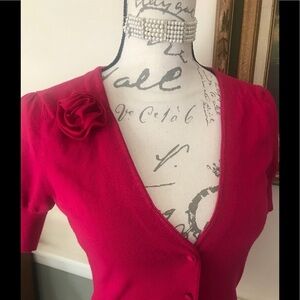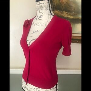 Cute Ann Taylor Loft Pink Fuchsia V-Neck Short Sleeve Cardigan.Excellent condition.Pretty flower on shoulder. Ships fast