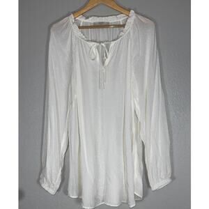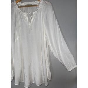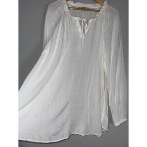 Long billowy sleeves with elastic cuffs. Clip dot all over pattern. Semi sheer. Ruffled neck with tie. Longer length tunic style. Thin lightweight airy - perfect for summer! Excellent preowned condition EUC, no flaws, no signs of wear. Professional, highly rated seller, quick shipper, open to offers!