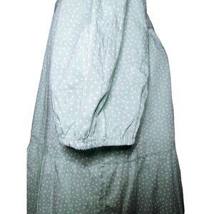 This is a very pretty shirt in a Sage green that is oversized with small polka dots, pinch pleats & Crotchet trim. There are layers & balloon sleeves. Shoulder to shoulder measures 17" x pit to pit measures 20" x shoulder to hem measures 26.5".