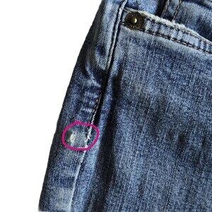 ** Condition: Normal wear with faded knees and butt area; slight fraying on side seams. 1 small stain on rear pocket as shown in last pictures (price reflects condition).