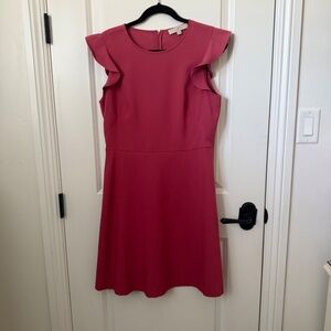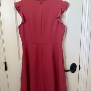 Ann Taylor- Rose Pink Color. Ruffle Trim Sleeveless. Fit and Flare Dress style. Previously owned, in great condition. Zipper down back with eye and hook clasp. Side pockets. Your can dress up or down. Super cute and flattering.