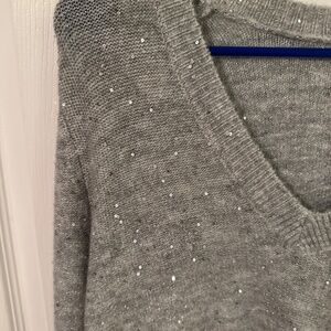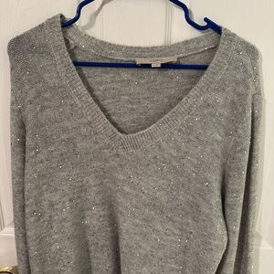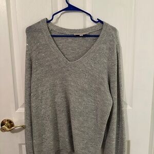 Ann Taylor Loft silver sequined long sleeve V neck sweater. Material is soft and not scratchy.