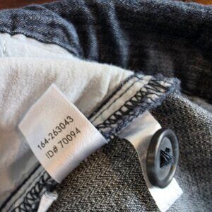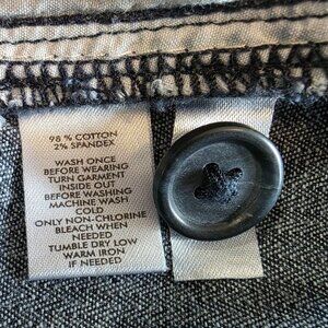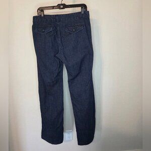 These trousers feature a professional wide-leg cut in a medium wash denim, offering versatility and comfort. The modern design includes a secure double-button closure and practical pocket placement, making these pants suitable for work or casual settings. These trousers provide a tailored yet relaxed fit.