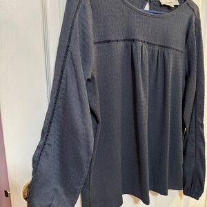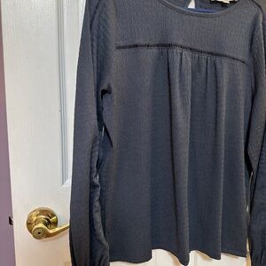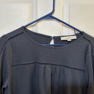 Ann Taylor Loft size medium. Long sleeve slate/dark gray blouse with open lattice accent down arms and across chest. Keyhole back.