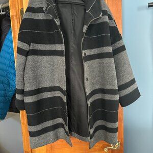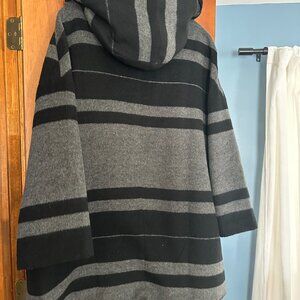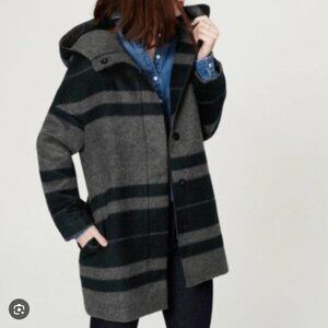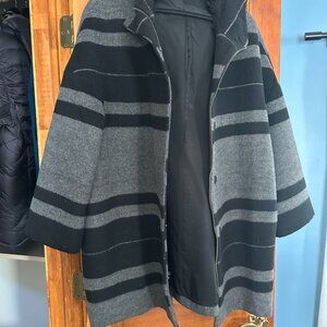 This Wool Coat is lightly worn. It comes to about the mid thigh and is very warm. Fleece lined hood makes it look and feel super cozy.