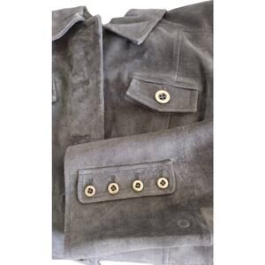 This is a brand new Ann Taylor Loft dark olive color, fully lined suede jacket with slit pockets. It has some tapering, a back slit and 4 buttons on the cuffs for added ornamentation. From shoulder to hem is 22", sleeves are 24.5" and armpit to armpit is19.5".