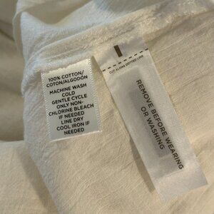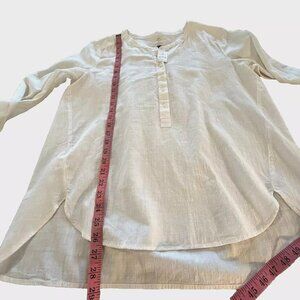 DESCRIPTION: A half button collarless rounded neck shirt in 100% ivory colored cotton in a relaxed tunic style fit with two button cuffed long sleeves and a shirtail hem. Comfy, casual style that could go from work to play. Ivory color. Machine wash.