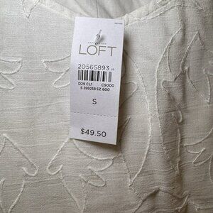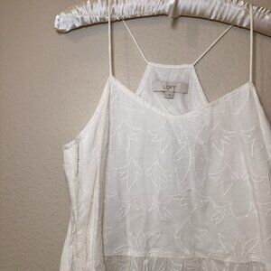 The product is a white embroidered peplum tank from Ann Taylor Loft, designed with a V-neckline and racerback. Made from a blend of polyester, rayon, and cotton, this size small tank features basic style and is perfect for women looking for a versatile and stylish addition to their wardrobe. The embroidered accents add a touch of sophistication to this wardrobe staple.