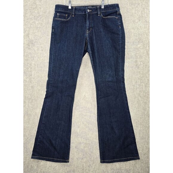 bootcut jeans, women's jeans, curvy fit, dark wash denim, size 12 jeans, stretchy jeans, Ann Taylor Loft, casual wear, mid rise, pre-owned jeans, machine washable, cotton blend, bootcut pants