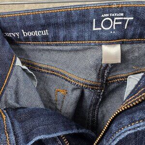 Ann Taylor Loft women's jeans featuring a flattering curvy, bootcut shape in dark wash denim. Made with a cotton blend for durability and comfort, these mid-rise jeans are versatile and stylish. Designed with functional pockets and contrast stitching detail. Pre-owned in good condition, with no noticeable flaws.