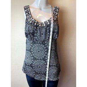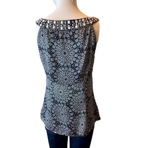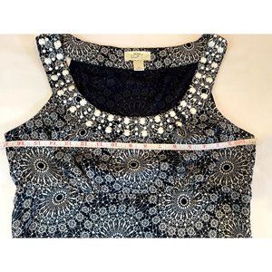 Ann Taylor Loft Women Zippered Blouse Top Beaded Collar Geometric Black White 6