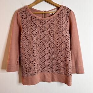 Ann Taylor Loft Women's Crochet Sweatshirt Top XS Pink 3/4 Sleeve Floral Lace
