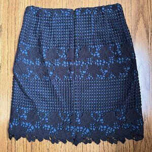 This Ann Taylor Loft women's mini skirt is a stylish and versatile addition to any wardrobe. The boho-inspired design features a floral pattern in black and blue, with crochet accents adding a unique touch. Made of cotton, this skirt has a mid-rise and a zip closure for easy wear. Perfect for various occasions from casual to formal, the skirt also features a lined interior for added comfort. Ideal for year-round wear, this skirt embodies a blend of American, bohemian, and city-inspired themes.