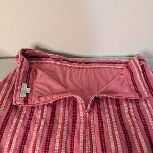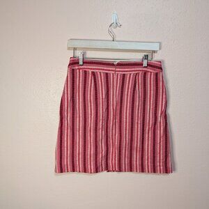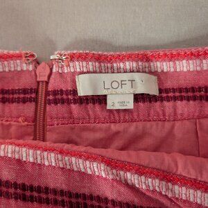 Keywords: Ann Taylor Loft, Faux Wrap Skirt, Mini Skirt, Pink, Striped, Woven, Cotton Blend, Zip Closure, Mid-Rise, Short Length, Summer, Spring, Casual, Machine Washable, Lined, Nautical, Preppy, Coastal, Vacation.