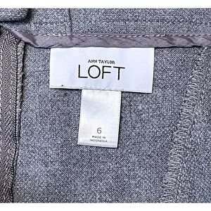 Good condition Brand- LOFT Material- 46% Polyester/45% Rayon/6% Cotton/3% Spandex Size- 6 Color- Gray Measurements: Waist- 30" Length from top to bottom- 21"