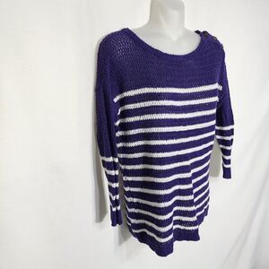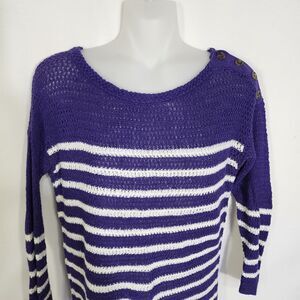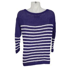 Ann Taylor Loft Womens Sweater Small Purple Ivory Striped Linen Blend Open Knit