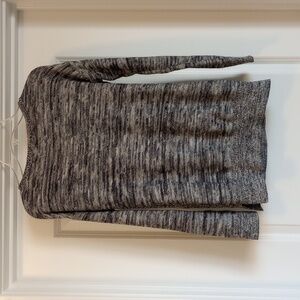 This is an Ann Taylor Loft women's pullover sweater in a size XS. It is a black and white Heathered pattern with long sleeves. It is in good condition. It is a cotton blend.