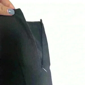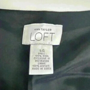 Keywords: Ann Taylor Loft, skirt, size 14, black, wool, acetate, knee-length, embroidered hem, formal, women's clothing, pre-owned, elegant, polished, Korea, dry clean.