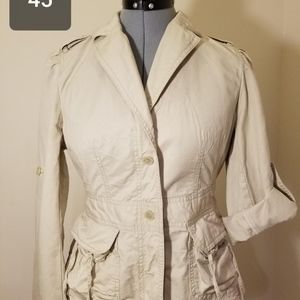 Excellent condition, tan cargo jacket, button front, long sleeves. All items are professionally cleaned, zippers, buttons, hems/seams have been checked. Items ready to wear.