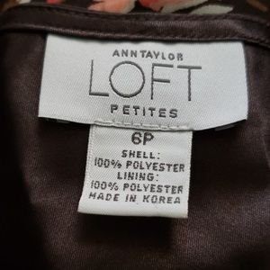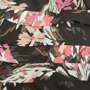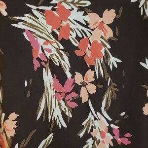 This a beautiful flowy floral dress. It has a brown satiny lining underneath. It measures 37" from shoulder to bottom of hem. 17" across the bust. 15" across waist. It's a low neckline and comes above the knee. It's a chocolate brown with peach, coral, pink, olive and white. It has little unnoticable snag on the front waist area shown in the last picture. But is in otherwise excellent condition.
