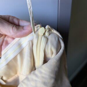 super comfy knit dress with liner. Is a size 2 but runs about a half to full size bigger (IMO). Has side zipper and hook closure and elastic band with rubber edging to keep from slipping. well made and well loved but no stains or flaws.