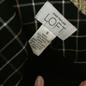 Cream and tan plaid on a black background. Wool/poly blend and fully lined. Side zip. About 19" long. (Please don't ask me to model; if it still fit me well, I would be keeping it! ๐)