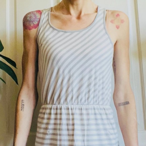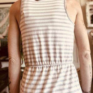 Ann Taylor LOFT business casual/spring dress with tank sleeves, light grey and cream horizontal stripes, good preowned condition.