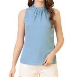 Loft Ann Taylor Smocked Neck top sleeveless pastel light blue gathered mock neck lightweight longline cotton polyester blend soft comfortable casual size Small