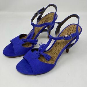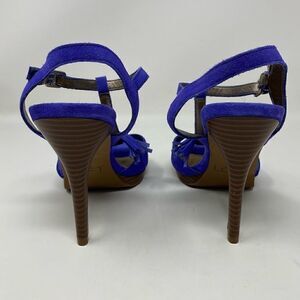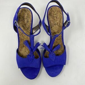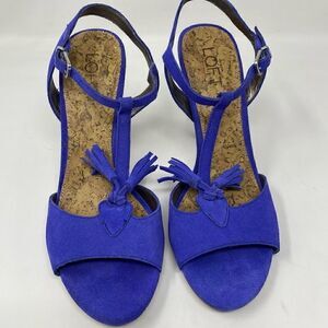 Ann Taylor Loft Sz 8 Bombay Blue Suede Strappy Tassel Stacked 4.5” Skinny Heel