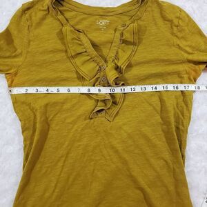 Ann Taylor Loft medium Olive green ruffle neck long sleeve button blouse