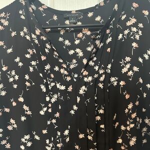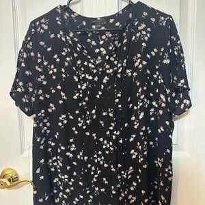 Ann Taylor size medium. Short sleeve slightly sheer V neck black blouse with light pink and white flowers with a pretty ruffle detailing down the front. Lightweight.