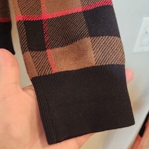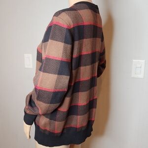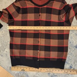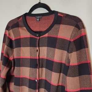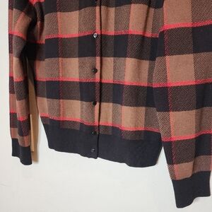 Ann Taylor Metallic Red Black Brown Plaid Button Knit Sweater Cardigan Cotton XL
