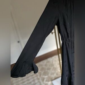 This black midi dress by Ann Taylor features subtle polka dot detailing and a flattering elastic waist, perfect for an elegant yet understated look. Ideal for both formal occasions and everyday wear.