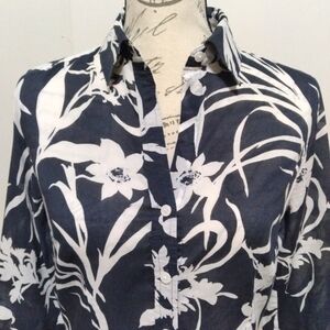 Ann Taylor Midnight blue button up top with exotic white floral print