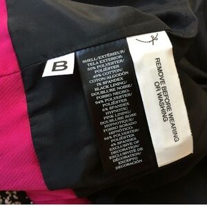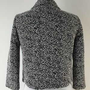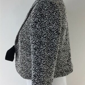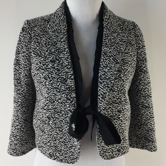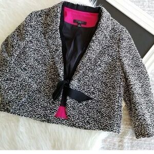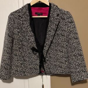 Elegant blazer with a textured black and white design. Features a stylish tie front. Perfect for office or casual outings. Cropped Jacket/blazer. Black and white. Black ribbon detail around collar. Black and pink lining. Ribbon front tie. Great for office, dressing up a look, or a cute dress jacket for a formal event!