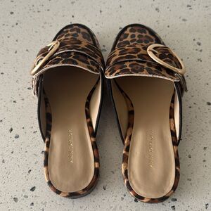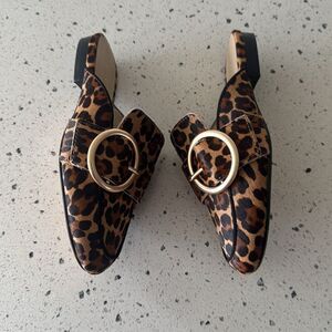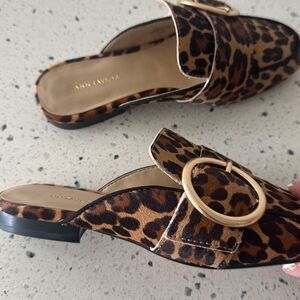 Step out in style with these chic Ann Taylor loafers, mules, Featuring a bold leopard print, these shoes add a touch of wild elegance to any outfit. Perfect for both casual and formal occasions.