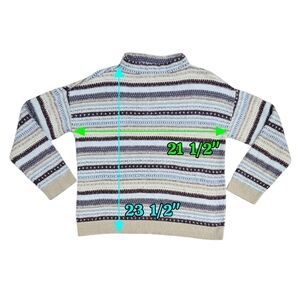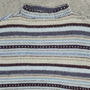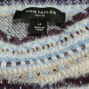PETITE. Good used condition, with no stains or tears. A multicolor fair isle sweater, with metallic threads. Has a funnel neck, drop shoulders and ribbed trim. Is fuzzy by nature.