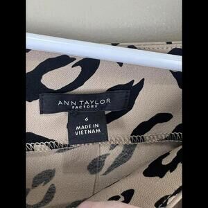 This Ann Taylor dress is a NWT shift dress in size 6. It features a black and beige cheetah animal print, square neckline, 3/4 sleeves, and a knee-length hem. The dress is made of lightweight polyester knit fabric with a beige to brown hombre accent and a zipper closure. Perfect for various occasions like travel, parties, work, or casual wear, this dress is a stylish choice with a designer and animal theme.