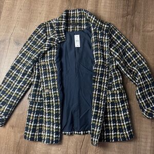Chic tweed fabric with navy and gold tones. Signature Ann Taylor style.