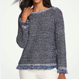 Ann Taylor Navy Blue Metallic Silver Sequin Boat Neck Fringed Knit Sweater