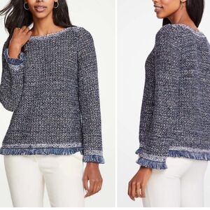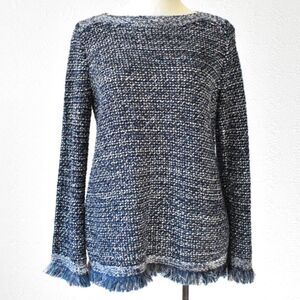 Ann Taylor Navy Blue Metallic Silver Sequin Boat Neck Fringed Pullover Knit Sweater