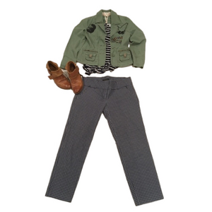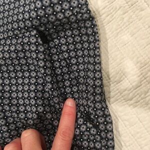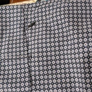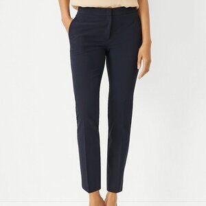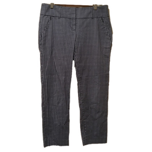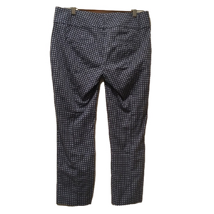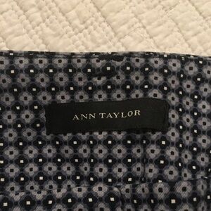 Ann Taylor's navy trousers feature a symmetrical floral pattern ideal for office wear. Made from a cotton-spandex blend, these pants offer comfort and a slim fit.
