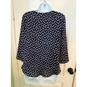 Classic and versatile, this Ann Taylor blouse features a navy background with a playful light beige polka dot print. Designed with a scoop neckline and 3/4-length sleeves, this top offers a relaxed yet refined fit, perfect for both office wear and casual outings. Lightweight fabric makes it easy to layer under a blazer or pair with jeans for a more laid-back style.