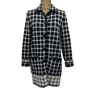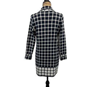 This Ann Taylor Navy Blue Long Plaid Cardigan Sweater Coatigan is a stylish and warm addition to your wardrobe. Perfect for cold weather, the coatigan is size XS and features a classic plaid design with pockets.