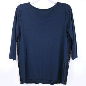 This Ann Taylor top features a navy blue base with intricate black lace detailing, offering a refined look. Designed for versatility, it includes pleated accents and 3/4 sleeves for a flattering fit.