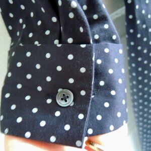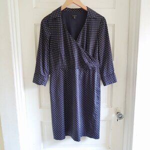 Ann Taylor navy & white polka dot stretch cotton dress, size 4 Petite. Elegant stretch cotton dress has a V neck, faux wrap crossover surplice bodice, ruching at left side, and 3/4 sleeves with turned up cuffs & button detail. Deep navy blue with small white polka dots. Fully lined, side zip closure, midi length, 5.5" kick pleat. Professional and classy, with understated retro flair. EUC.